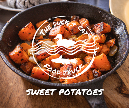 Roasted sweet potatoes candied with The Duck & Cat’s classic maple-sage brown butter, garnished with crisp fried sage leaves.